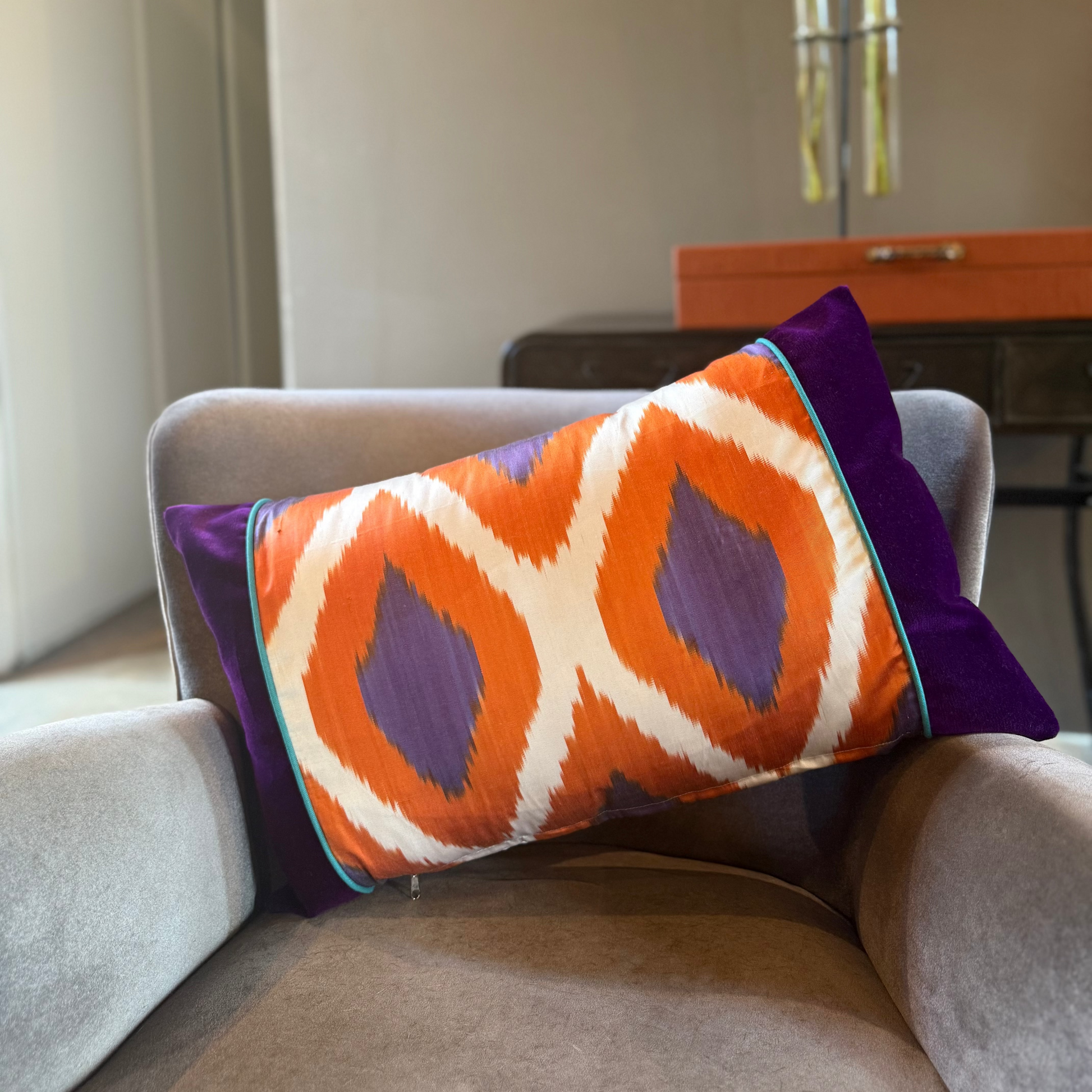 Descrizione: seta ikat fantasia e velluto viola su entrambi i lati - profili turchesi.