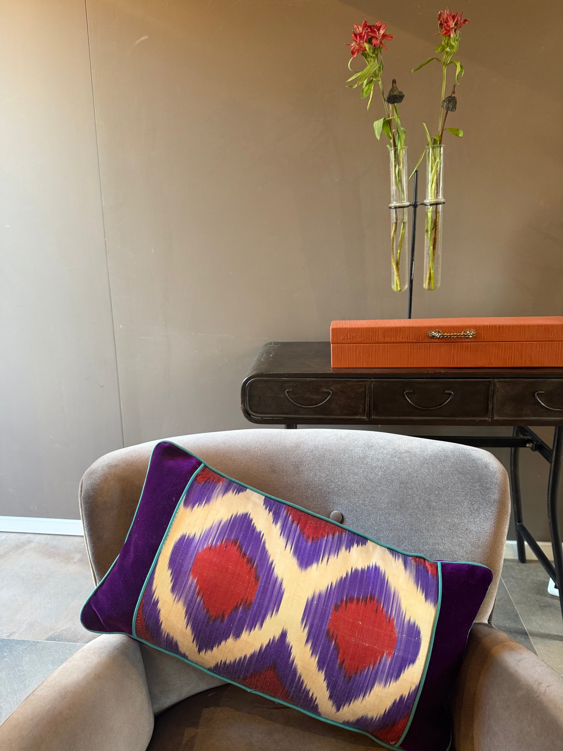 Il velluto italiano e la seta Ikat prendono forma grazie a una manifattura interamente Made in Italy, dove ogni dettaglio dai profili colorati alle cuciture è curato con precisione e passioni.