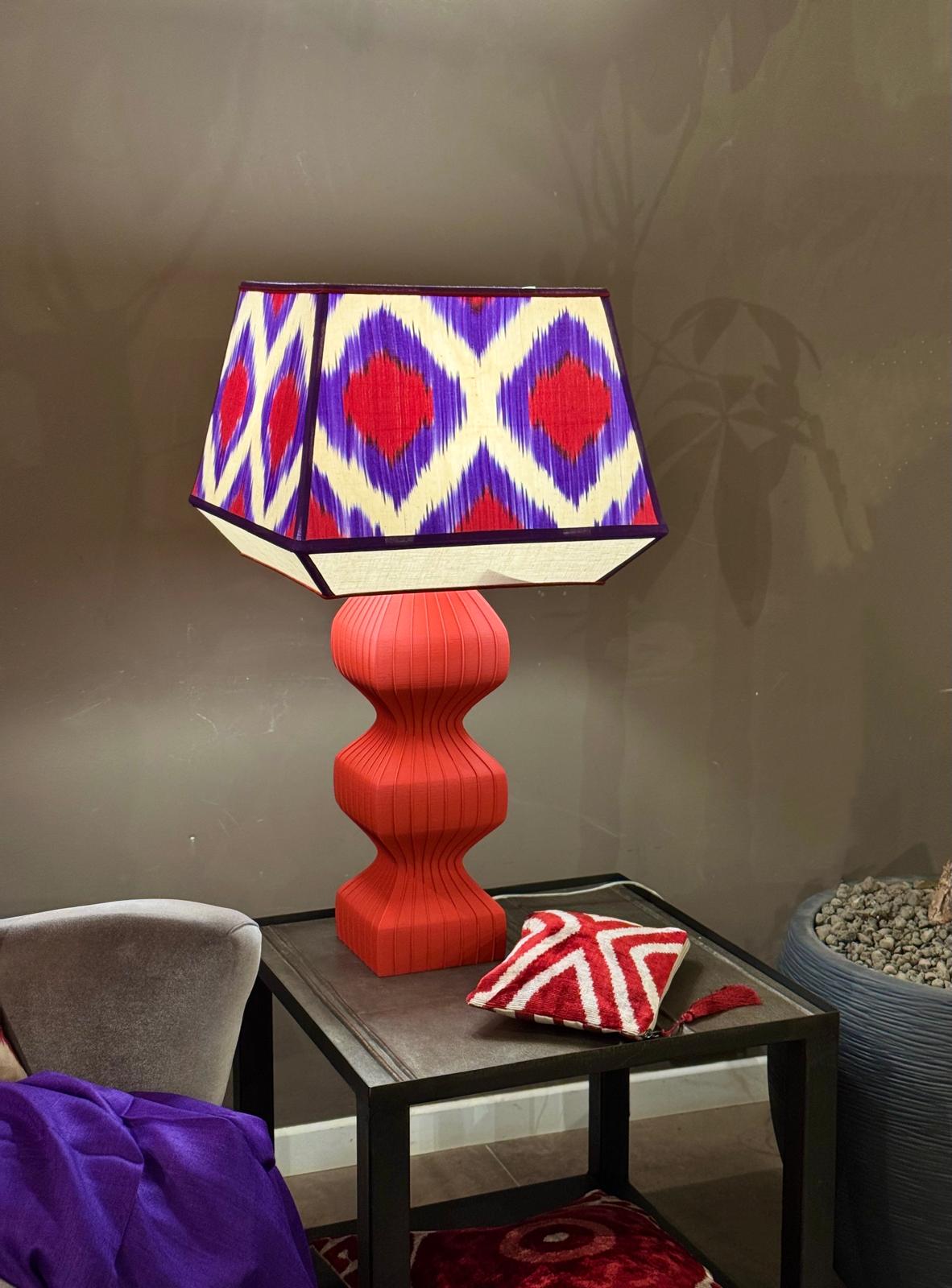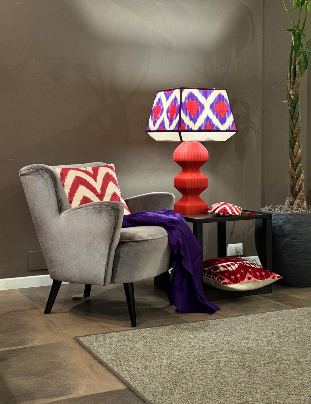 Paralume in lino panna con inserto in seta ikat fantasia